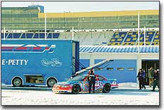 The Petty team prepared last week to load a racecar in the "Richard Be Petty" semitrailer at Kansas Speedway. A press conference to announce the Petty partnership with the Speedway was postponed one week because of a Kansas City snowfall, and the driver of this truck predicted that the truck's departure would be postponed for several days because its wheels were frozen in ice.