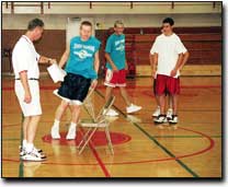 - Mike Webb, Chieftain basketball coach, times Brett Cruickshank while teammates look on during last weeks summer basketball camp. The camps focus was on fundamentals, but the team did work on some offensive and defense plays.