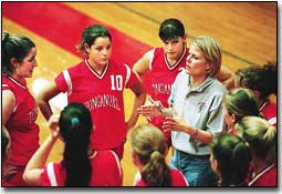 Kelly Alexander, Tonganoxie coach, gives her players insrtructions during Tonganoxies Oct. 17 tournament. The team ended its season after failing to qualify for further play at Saturdays sub-state tournment at Topeka-Hayden.