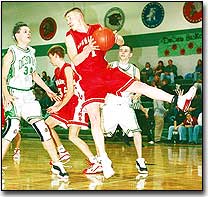 Scott Breuer grabs a rebound while Bryan Gurss gets ready to head to the other end in the boys' win against DeSoto Friday night. The Chieftains beat the Wildcats 54-42 for their seventh win.