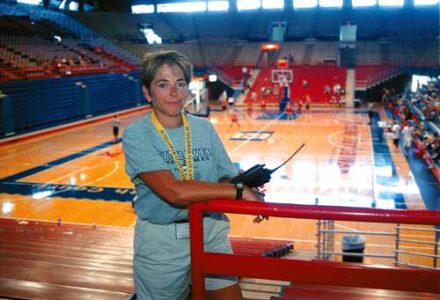 Vicki Hill, director of the Sunflower State Games, supervises basketball games in Allen Fieldhouse on the University of Kansas campus in Lawrence. Hill, a rural Tonganoxie resident, is in her second year as director of the games.