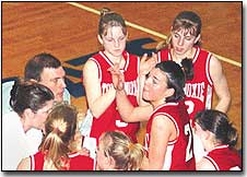 The Chieftains gather for one final huddle in the closing seconds of their second-round, Sub-State victory over top-seeded Jefferson West. The time out was called following an Andrea Korb free throw that put the Chieftains up by four and out of Jeff West's reach.