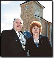 Herman and Waneta Karriker stand in front of the Assembly of God church, which is being rebuilt after the original church was destroyed by a tornado.