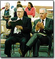 Herman Karriker, left, and John Benson, take front-row seats as song leader Fred Cleaver leads the congregation during Sunday morning's worship service.