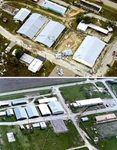 Top, this was the aerial view of the Leavenworth County Fairgrounds after a tornado struck on May 11, 2000. This photograph was made the morning after the tornado swept through town. Bottom, in this aerial photograph, which was made several weeks ago, the work that's been done to the Leavenworth County Fairgrounds is evident. This photograph looks south-southwest, toward Kansas Highway 16.