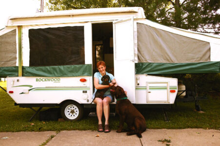Shellie Hardisty holds her dog, Dottie, as she sits in the doorway of her popup camper. Hardisty, Dottie, and her other dog, Cocoa, visited Hardisty's family in Tonganoxie during the Fourth of July weekend, before heading back to continue her year-long tour.
