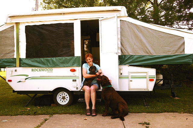 - Shellie Hardisty holds her dog, Dottie, as she sits in the doorway of her popup camper. Hardisty, Dottie, and her other dog, Cocoa, visited Hardisty’s family in Tonganoxie during the Fourth of July weekend, before heading back to continue her year-long tour.