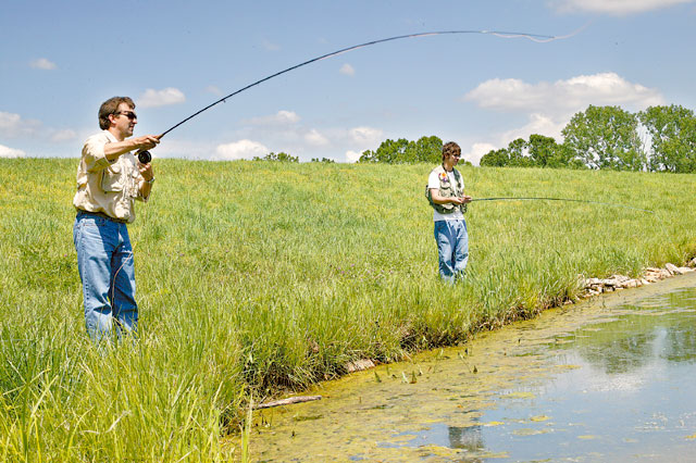 At a 15-acre farm lake near Tonganoxie, he stands on the bank, fly rod in hand, ready to angle for fish. Nearby his son, Jerrod, has a head start. Jerrod swings his fly rod over his shoulder, then tips it forward. His 4-pound test line loops into a perfectly folded horizontal line seconds before it arcs some 50 feet from the tip of the rod, landing the fly on the cool water’s surface.