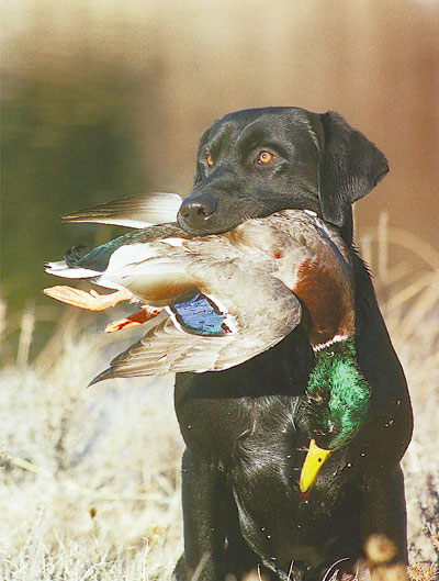 - Hank, a black Labrador retriever, holds a mallard duck shot on a hunting trip.