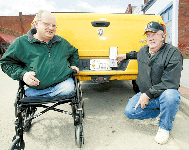 Terry Brown holds his Purple Heart as he kneels by his truck's license plate, which has a Purple Heart on it. With Brown is Jim Rogers, who helped Brown obtain his medal.