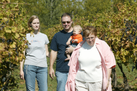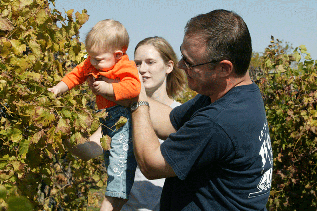 Kevin and Denise Trummel, Lawrence, introduce their daughter, Ellie, 8 months, to the vineyard at Holy-Field Winery.