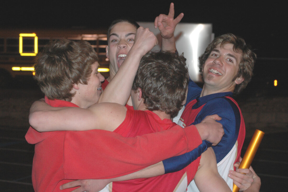 - Tonganoxie High’s boys 4×400 team – Bret Koch, D.J. Lindsay, Jeremy Carlisle and Austin Stone – celebrate after finishing first in the finals on Tuesday at the Tonganoxie Invitational.