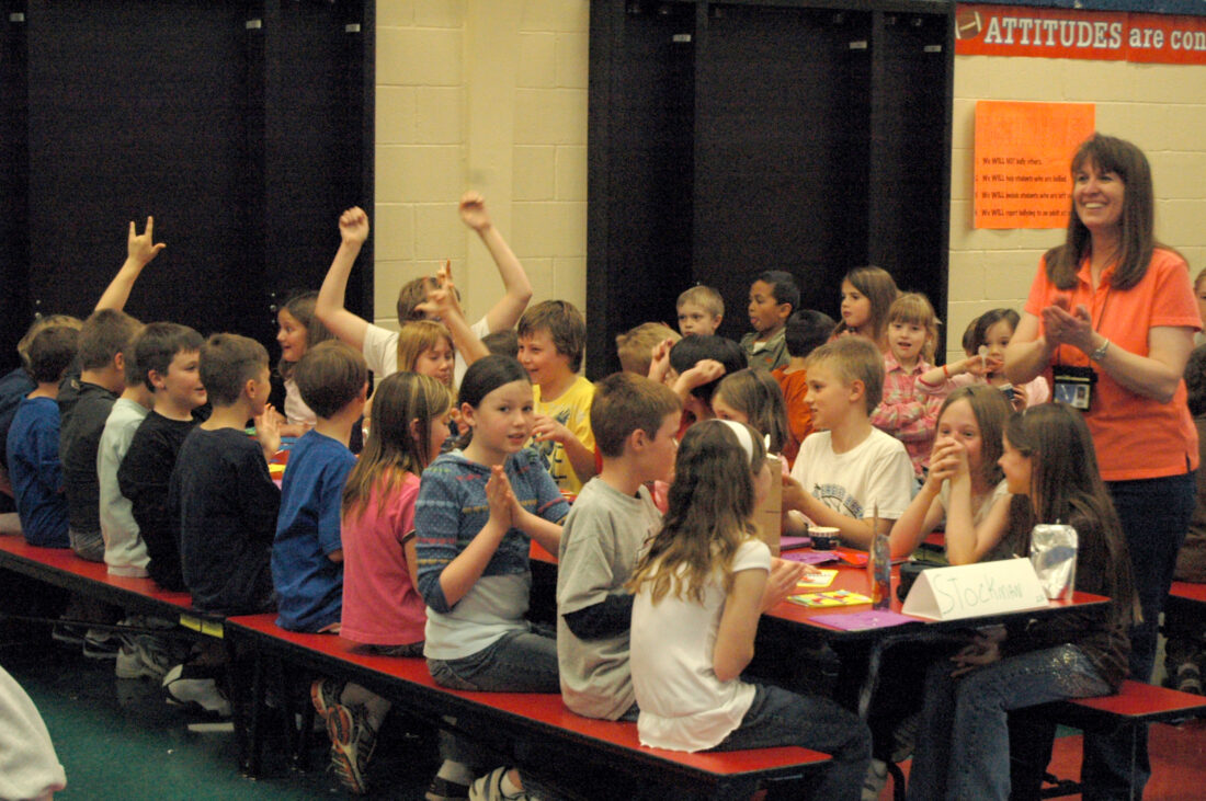 Tonganoxie Elementary School teacher Karen Stockman and her third-grade class react to the news Thursday, April 17 in the TES south gymnasium that their book, "K is for Kansas," was selected as one of 25 winners in a national publishing contest.