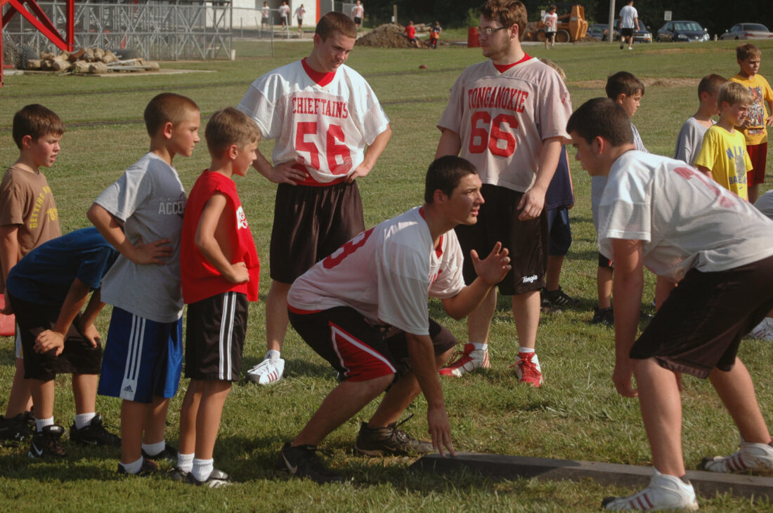 But the prep players didn’t let that get in the way of helping out the youngsters. Senior lineman Billy Seymour, who started attending the camp when he was in seventh grade, said the elder statesmen helped the less experienced kids with the basics, working on the little things: “Taking the right step, the right angle, stuff like that,” he said.