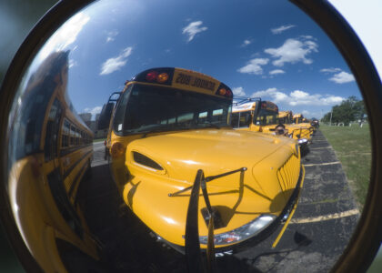 - School buses are reflected in a sideveiw mirror in the Tonganoxie High School parking lot. Buses are the only school vehicles driven home by Tonganoxie School District employees.