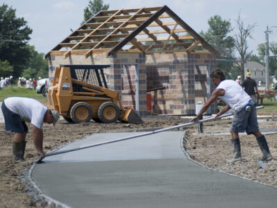 Doug McInroy and Jeff Watson broom concrete on a sidewalk leading up to the new entrance to Beatty Field, which is being constructed at the southwest corner of the facility. The Chieftain Remembrance Walk also is being built in front of the THS east campus.