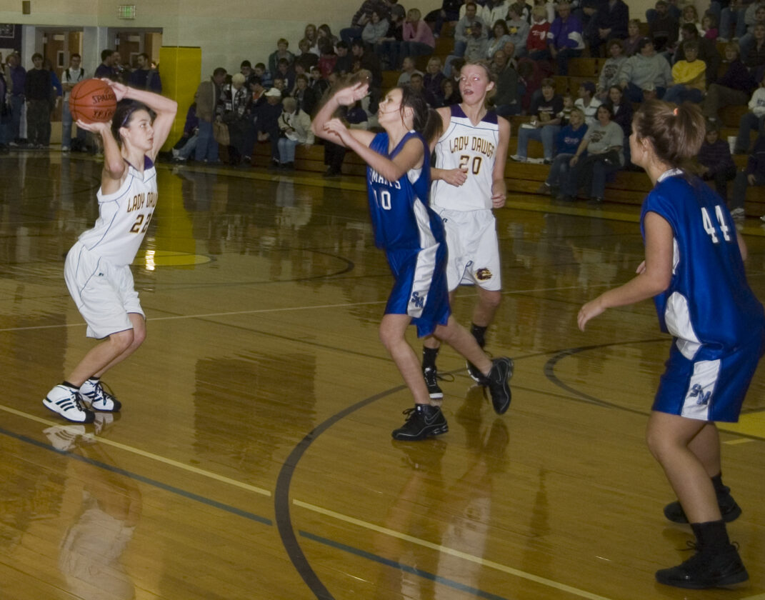 - McLouth High junior Missy Rome prepares to launch a deep three-pointer in the waning seconds of the third quarter. MHS lost to St. Marys, 65-39.