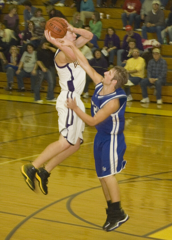 - McLouth High senior forward Derrick Crouse elevates over a St. Marys defender for a jump shot during the Bulldogs’ 63-20 loss to the Bears on Friday night at McLouth.