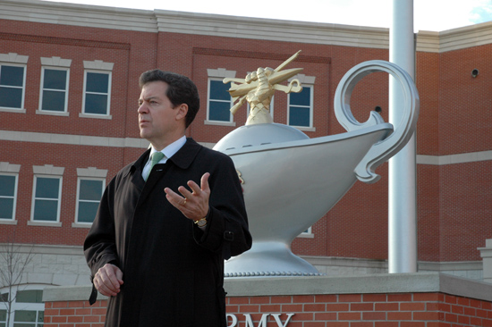 U.S. Sen. Sam Brownback speaks with reporters in front of the Lewis and Clark Center at Fort Leavenworth following a press conference he gave Tuesday concerning the transfer of enemy combatants from Guantanamo Bay to the base. Brownback opposes bringing prisoners from Guantanamo Bay to Fort Leavenworth and has introduced a bill to stop it from happening.