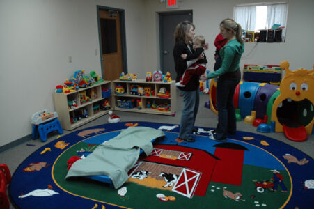 Shelly Snyder, left, and Sara Snyder, co-owners of All About Kids daycare, work with Tonganoxie twins, Terrick and Tayden Trobough, 2, after their nap. The new daycare facility is located at K-7 and Donahoo.