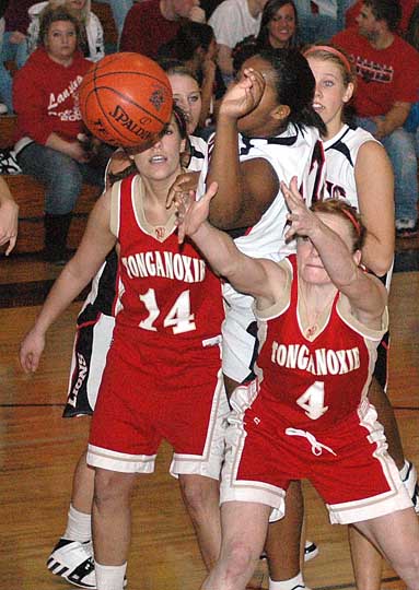 - Lansing junior Alexis Ellis reaches over Tonganoxie senior Tracie Hileman during a battle for a rebound Friday night.