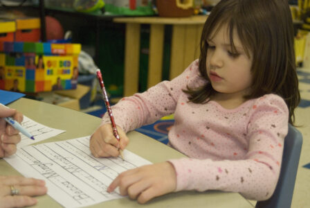 - Becca Mingle, 6, practices writing her name during Denise Smith’s Friday kindergarten class. On Monday, the Tonganoxie School Board unanimously voted to have kindergarten all day, every day beginning with the 2008-09 school year instead of all day, every other day.
