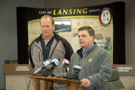 - With Lansing Police Chief Steve Wayman, left, looking on, Leavenworth Acting Police Chief Pat Kitchens addresses the media during a news conference Wednesday, Jan. 23, at Lansing City Hall. Kitchens announced authorities were detaining a “person of interest” in the fatal shooting of Olivia Jackson. The 20-year-old Jackson, who was pregnant, was shot to death at a Lansing mobile home park Tuesday, Jan. 22.