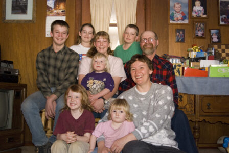 The Parsons family, bottom row from left , Josie, 6, Virginia, 19 months, and Amy; middle row from left, Ira, 15, Naomi, 13, Rose, 4, and Rodney; back row Leah, 10, and Galen, 11, is being honored this weekend for its adherence to sound soil conservation practices. The family farms about 460 acres near Jarbalo.