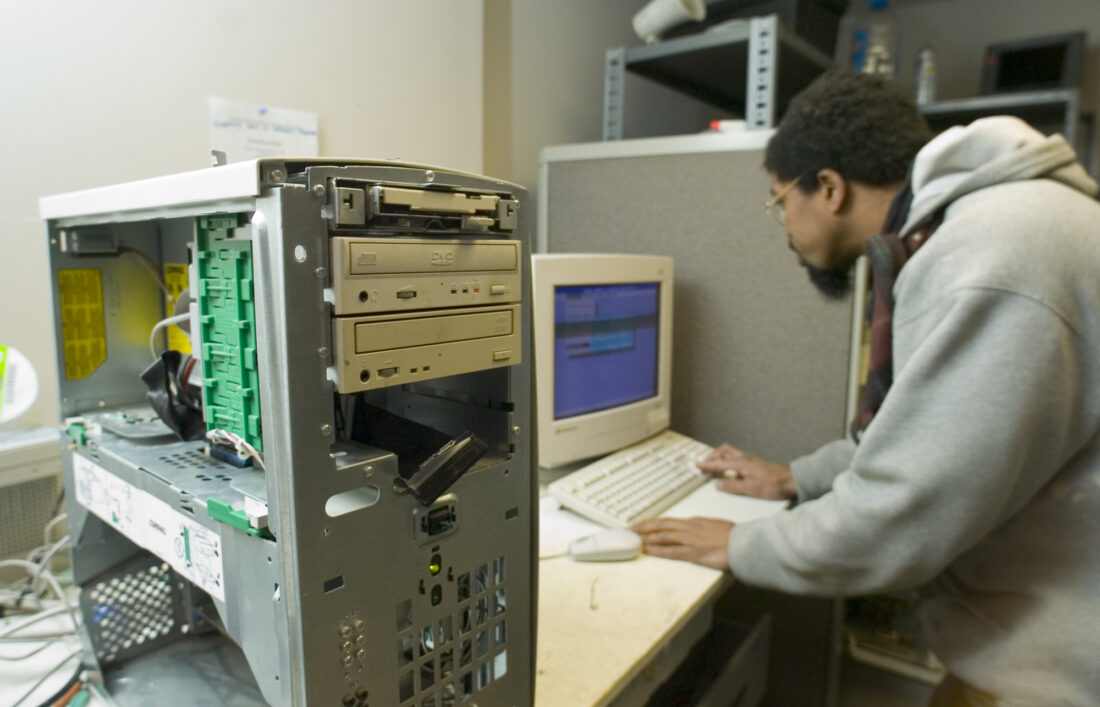 At Entrust Computers in Kansas City, Kan., technician Brian Parker was working on installing new software into old computers. The company offers very low priced computers to low-income customers.