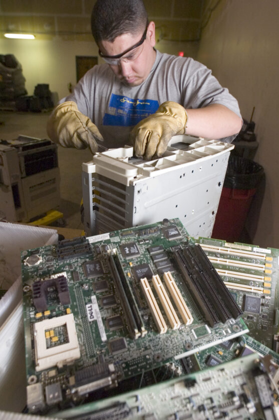 - Luis Contreras works at deconstructing parts out of a computer at R3 Technology. The parts will be sent to EPA-approved recycling companies.