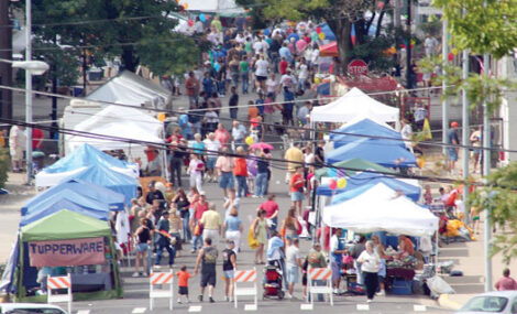 - Crowds and exhibitors tents lined up on Second Street under a cloudy Tiblow Day sky.
