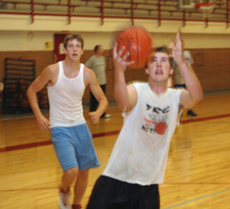 Jamie Everett, right, goes in for a layup as Austin Smith follows during Tonganoxie High basketball camp in June. The Chieftains spent their Monday evenings that month competing against other prep teams from Kansas and Missouri at Rockhurst University in Kansas City, Mo. Tonganoxie won three of their last four games in the summer league and went 4-6, overall.