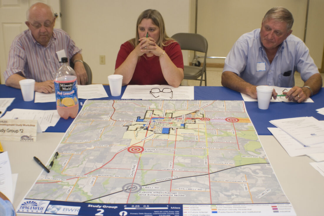 - John W. Evans, Paula Crook and Bill New and several other city leaders and business owners attended a public visioning workshop July 16. The workshop was held by Bucher Willis & Ratliff, the city’s planning firm.