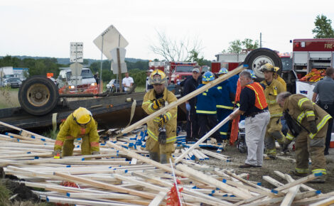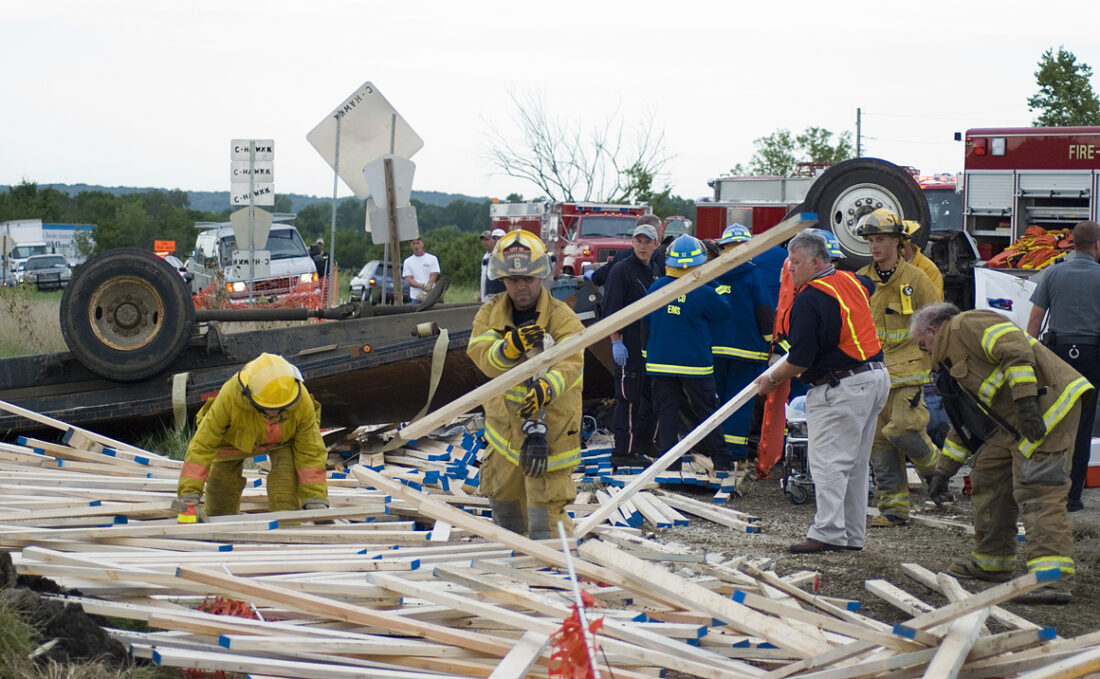 - Emergency workers remove the lumber from a lumber truck to clear a path for Leavenworth County EMS to move the truck’s driver to an awaiting LifeStar helicopter. The accident occurred around 4:13 p.m. at U.S. Highway 24-40 and County Road 1.