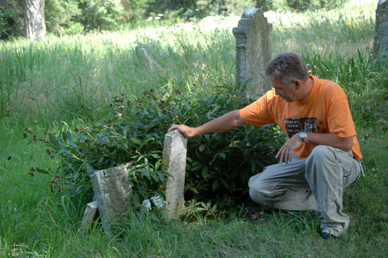 Rick Joyce, the owner of Leavenworth-based Affordable Lawn and Cemetery Care, reads one of many headstones in the High Prairie Cemetery, west of Leavenworth on High Prairie Road. Joyce's company has contracted with several local cemetery and township boards to clean up forgotten or abandoned burial grounds that are at the point of disrepair.