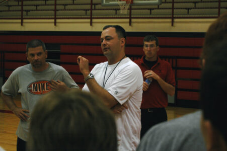 Tonganoxie High boys basketball coach Shawn Phillips addresses high school campers last week at THS basketball camp. Phillips, entering his first year as coach of the Chieftains, and returning varsity players used the camp as a chance to get a better feel for one another.