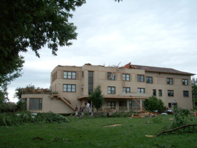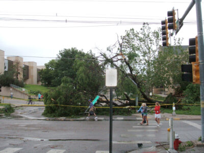 The next morning, Keyes ventured out to check the damage. He was shocked that their home at 16th and Osage streets was only two blocks away from the edge of the destruction. He went to the Acacia Fraternity to see if his fraternity’s house was still intact. It was, but he said the fraternity house across the street had severe roof damage. He said there was extensive damage throughout campus.