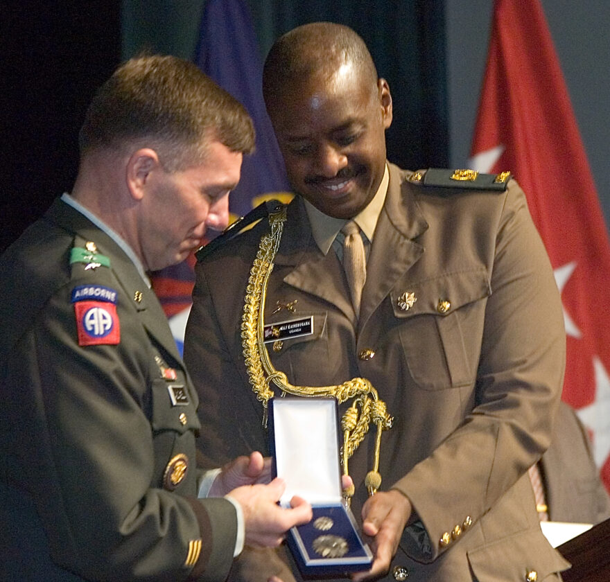 Lieutenant General William B. Caldwell IV (left) presents Maj. Muhozi Kainerugaba of Uganda his badge for completion in the U.S. Army Command and General Staff College at Fort Leavenworth Thursday. Maj. Kainerugaba, the son of President Yoweri Museveni of Uganda.