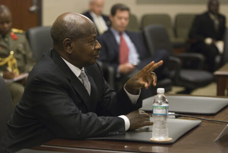 - Ugandan President Lt. Gen. Yoweri Kaguta Museveni talks to reporters during a 20-minute press conference following the graduation ceremony at the Command and General Staff College at Fort Leavenworth Friday. Museveni and his wife, Janet K. Museveni, were at the Fort because their son, Ugandan Army Maj. Muhozi Museveni Kainerugaba, was one of 50 international military officers who graduated.