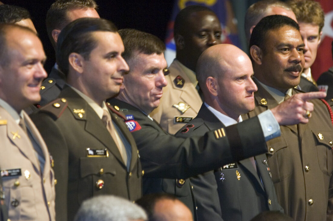- During a group photo session with the graduating class of the U.S. Army Command and General Staff College, Lt. General William B. Caldwell IV (center) points to some of the family members in the audience at the Eisenhower Auditorium at Fort Leavenworth.