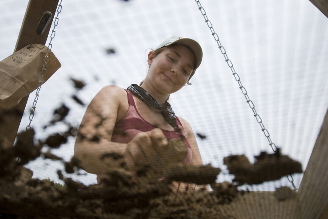 Jess Gisler, a Kansas State University junior from Prairie Village, crushes dirt through a metal mesh in an attempt to find artifacts from an ancient culture.