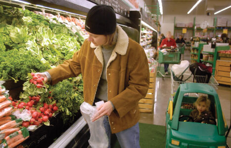 Lawrence shopper Dana Lattin and her daughter Sylvia, 4, look for vegetables at a good price. As food costs increase, many families are trying to maximize their dollars at the grocery store.