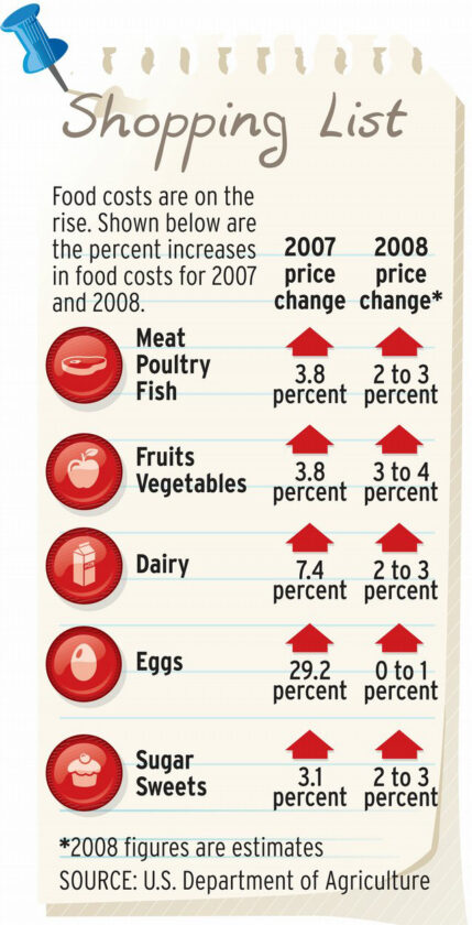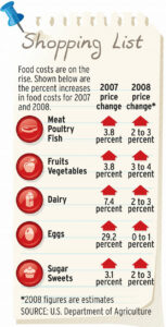 Escalating fuel costs also figure in. Buying cereal and bakery products – items particularly reliant on wheat, a commodity now selling at near-record price levels – will cost consumers another 5.5 percent to 6.5 percent this year, the USDA projects. Increases for dairy, eggs and meats will ease somewhat, according to USDA, but nobody expects any dramatic drops.
