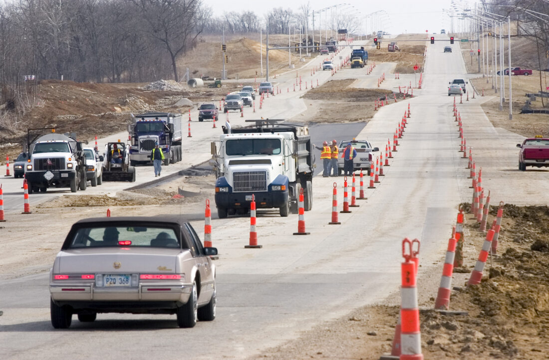 Traffic slows in a construction zone on State Avenue near Kansas Highway 7. Beginning today, ramps on and off K-7 at U.S. Highway 24-40, or State Avenue, will be closed for most of the rest of the year for construction of a new interchange.