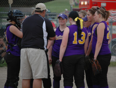 McLouth High softball players listen as coach Ballard Patterson goes over defensive strategy during a tight contest with Silver Lake that was eventually suspended in the 10th inning with the scored tied, 4-4.