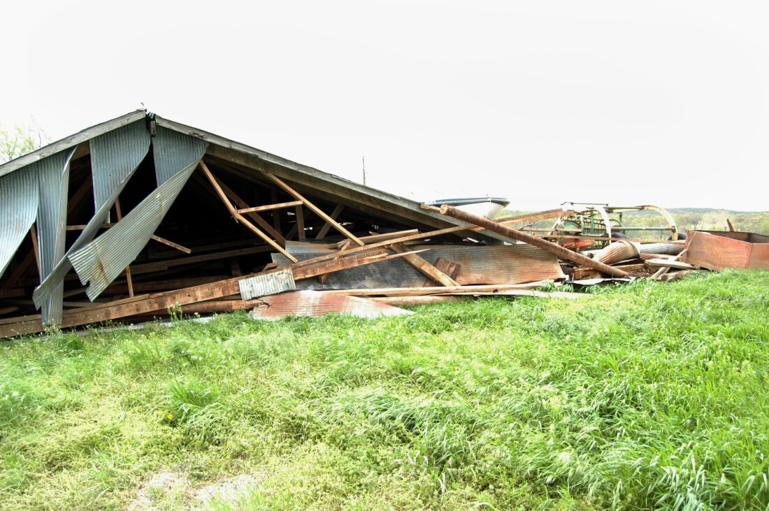 The barn, which was about 50 feet by 60 feet, was leveled. The roof was displaced just to the east of where the barn originally stood, while equipment inside the barn, remained in its place. Portions of the barn’s walls, which Andy said stood about 12 feet, were strung out in pieces several feet to the east. In addition, a nearby tree was uprooted and the family’s trampoline was displaced, wind leaving it tattered and twisted in another tree.