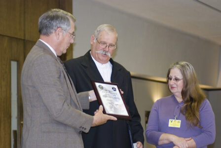 Willard Harper, FAA representative from the Kansas City International Airport, left, presents Larry Turpin, and his wife Jeanne Turpin, with the 2008 Charles E. Taylor Master Mechanic Award Thursday. Turpin was nominated for the award after completing 50 years in the aviation industry as an accredited mechanic.
