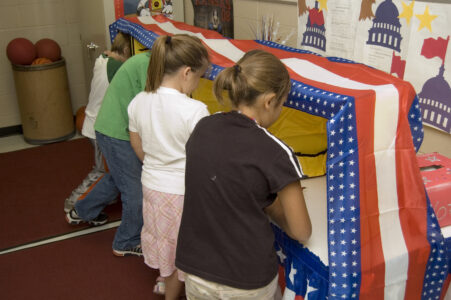 In a mock election that included teachers requiring students to take part in voter registration, 68 third-graders voted for Obama, while 59 selected John McCain. Third-grade teacher Karen Stockman said the election was a tie before the last class pushed Obama over the top.