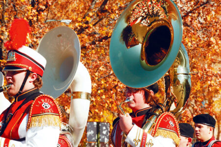 - Members of the Lansing High School marching band participate in the Leavenworth Veterans Day Parade under a canopy of fall leaves.