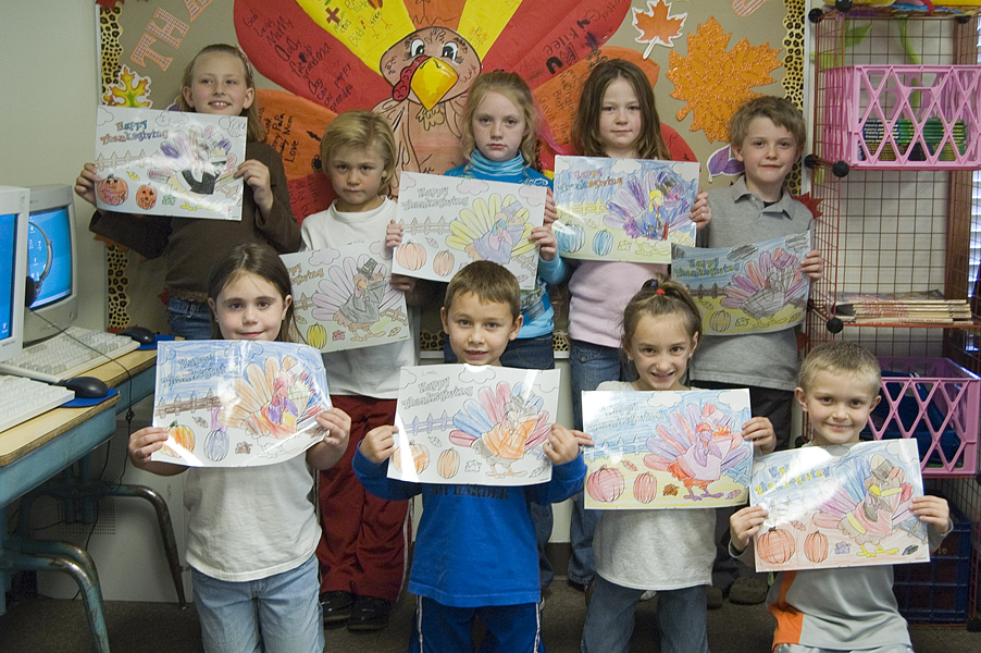 - Students in Kathy Link’s second-grade class at Genesis Christian Academy made “Happy Thanksgiving” placemats for pen pals at Tonganoxie Nursing Center. Front row, from left, are Ashley Gallagher, Brett Ingeron, Taylor Lynne and Salem Clemens; back row, from left, Kiles McConnaughey, Asher Robbins, Jill McMacklin, Samantha Stewart and Alex Christian.